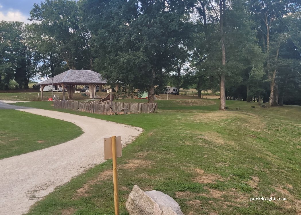 Coin tranquille au bord d'un lac à proximité du village super sympa et de l'A20 Idéal pour faire une pause sur un trajet Des jeux pour enfants et un petit parcours sportif Il y a des toilettes et un lavabo avec possibilité de remplir le réservoir d'eau au robinet Accueil super Merci à la commune