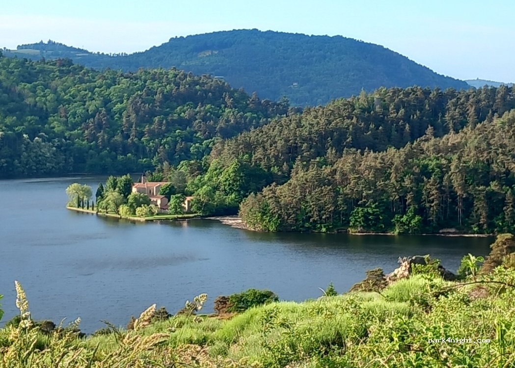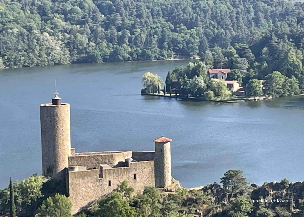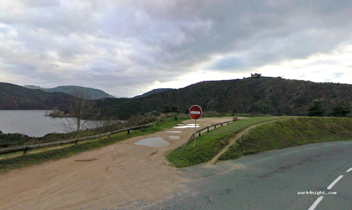 Parking en terre bien entretenu, calme (mai 2018 en semaine), en retrait de la route. Vue panoramique sur les gorges de la Loire avec le château et l'île de Grangent en contrebas. Panorama digne des lacs italiens voire des Highlands. Quelques centaines de mètres en aval, vue plongeante sur le barrage de Grangent, accessible également à pied, assez impressionnant en période de lâcher d'eau.