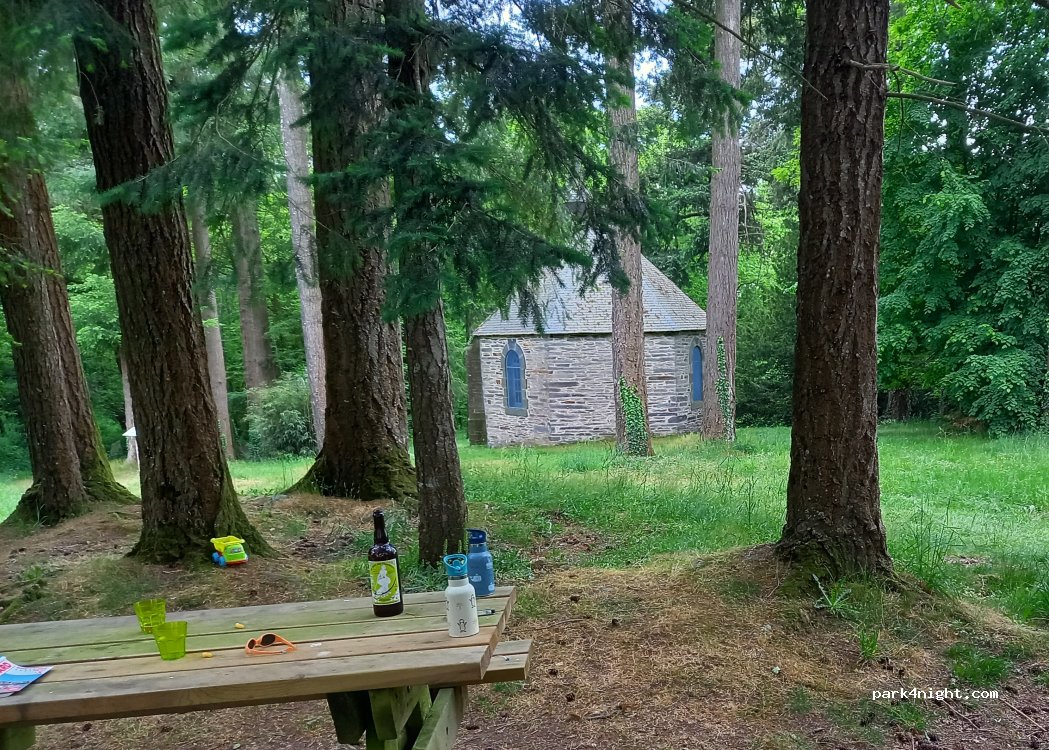 Spot au top, près de la petite chapelle Saint Jugon. A l’orée de la forêt. Calme, verdure, chant des oiseaux. Pas de voisins cette nuit. Wc propre et robinet d’eau : merci la mairie. Laissez l’endroit propre en partant.