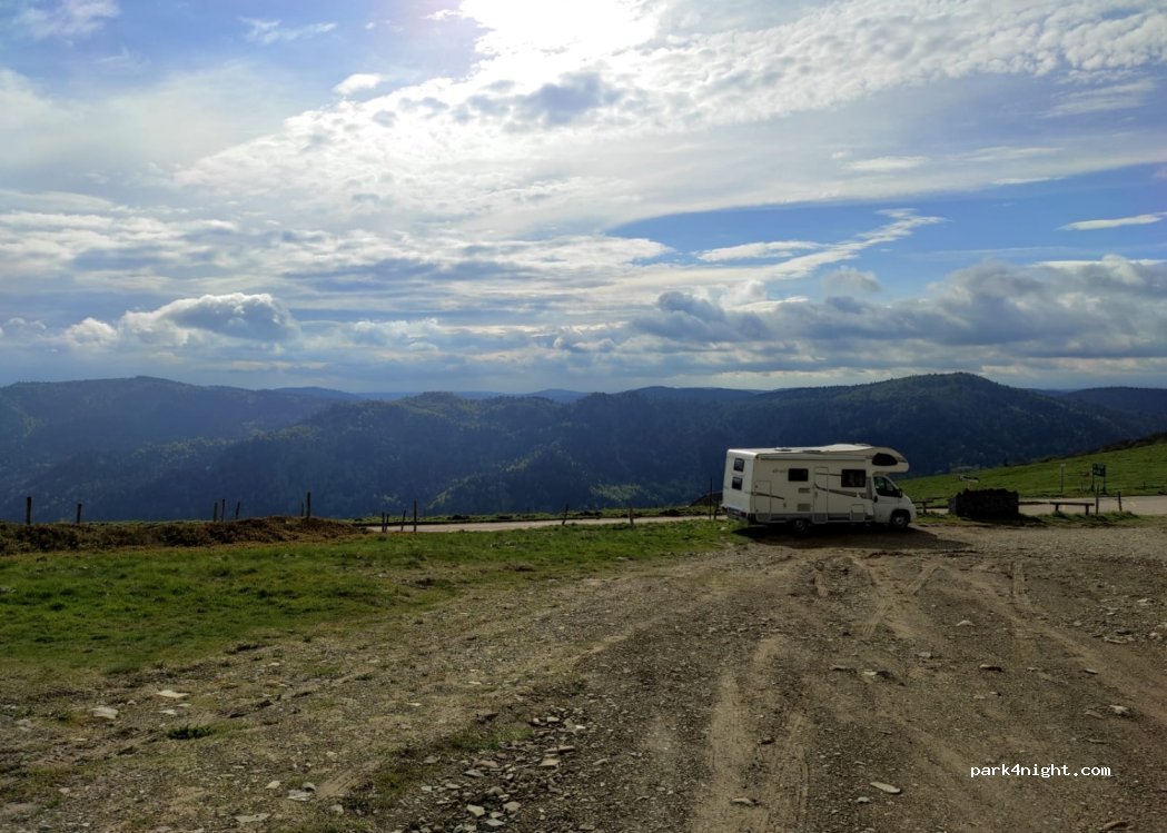Start parking lot. Sloping at first glance but flat at the entrance to the parking lot. Place for two vans or a capimg-car. Great view! Quiet road. Huss closes below.