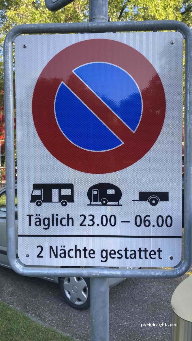 parking payant CHF 8.- pour une nuit aucun problème. A côté des services communaux, mais pas trop bruyant. Idéal pour une visite en vélo à Constance. possibilité de dormir également avec les mêmes conditions près de la piscine