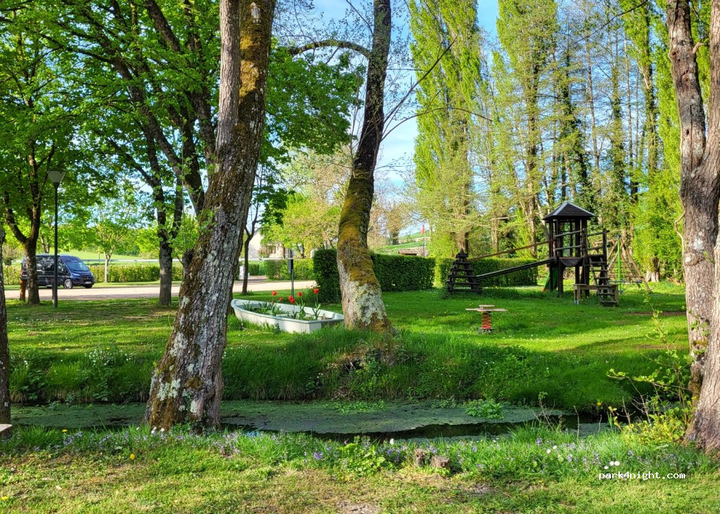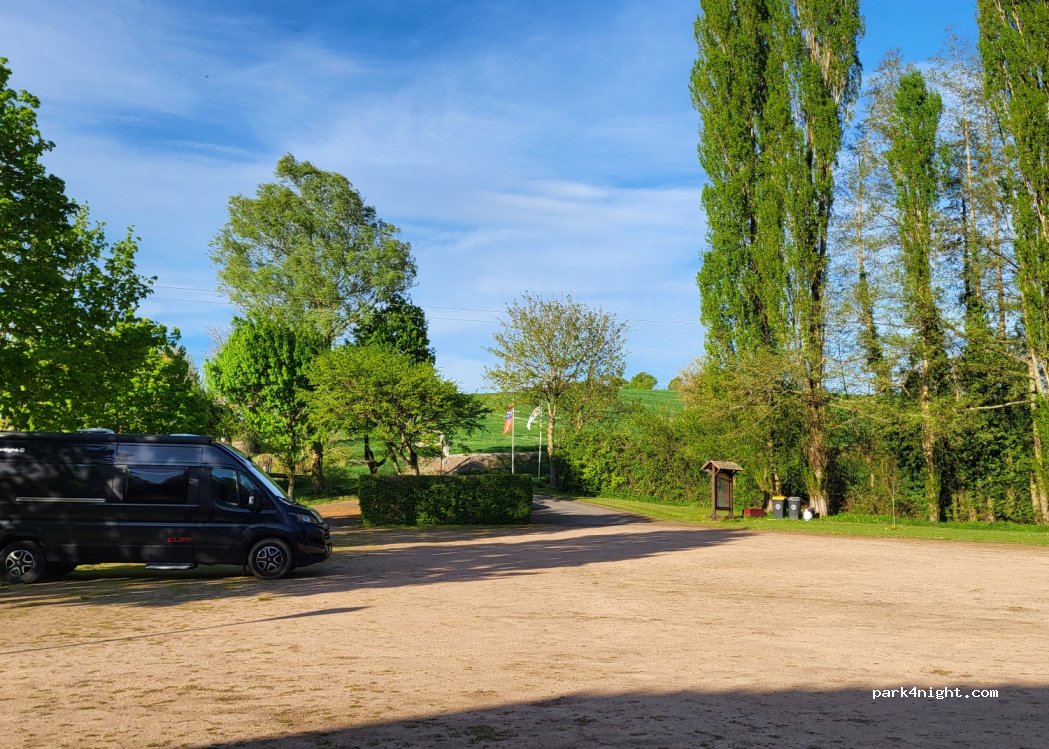 Air de camping car très bien pour seulement 6 euros avec électricité, parc de jeux pour enfant, étangs, calme. Nous sommes arrivé vers 21h sans problème. paiement le lendemain matin avant notre départ.