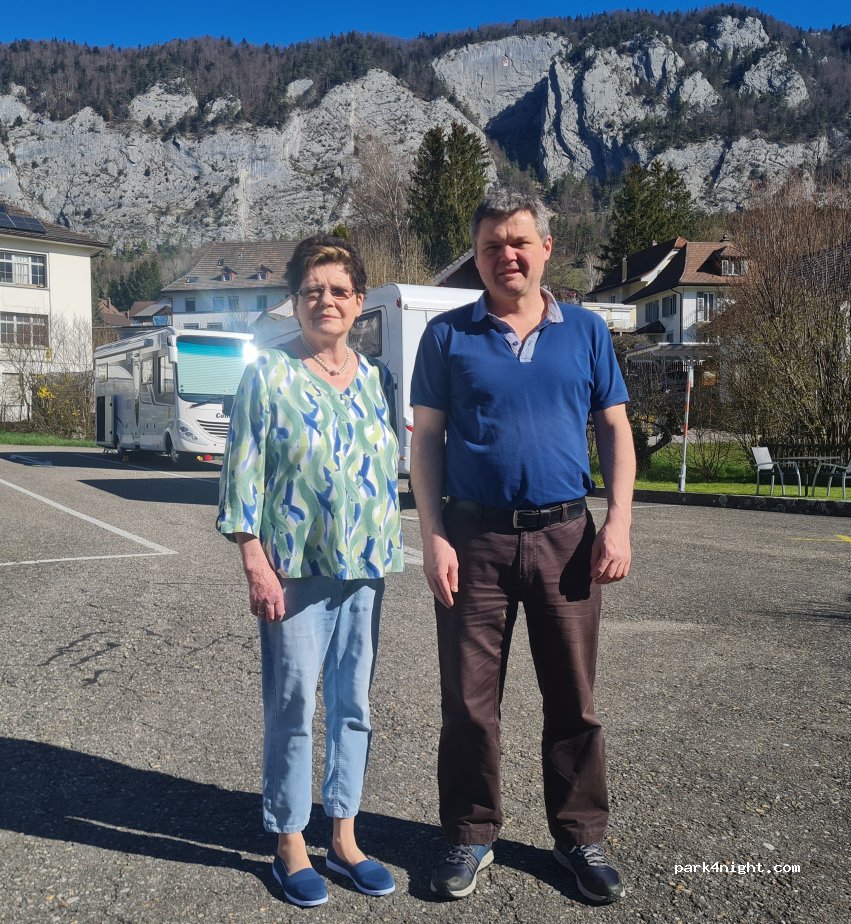 Great park up. We were the only van there, van and peaceful little village. Shop down the street. Football net in small garden which our boys made use of the whole stop. Garden with tables and umbrella for shade from sun. 10chf for 24 hours. Services offered to us, although we did not need on this stop. Thank you. Would recommend.