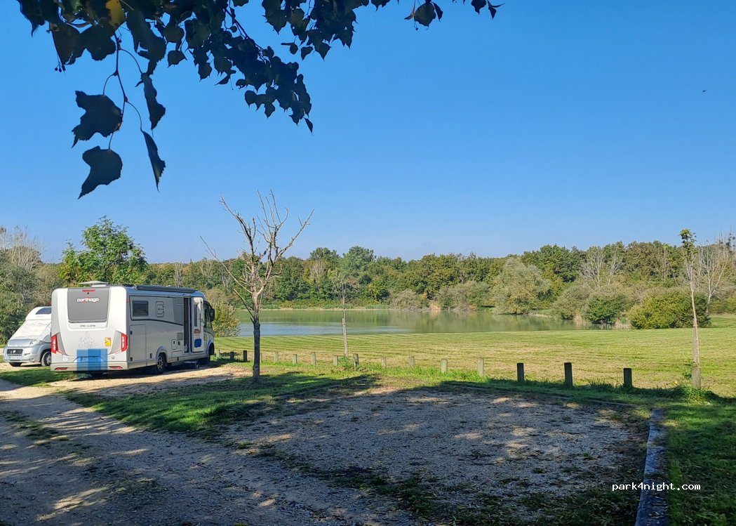 Très jolie aire en bordure d'un bel étang. Comme dit précédemment les emplacements sont un peu en pente et des chiens aboient souvent le jour dans l'un des jardins en face. Nuit très silencieuse en revanche. La borne marche très bien, nous avons acheté nos jetons à la petite épicerie située en retrait de la mairie. 2€ pour 2 heures d'électricité ou 100 L d'eau c'est plus que correct !