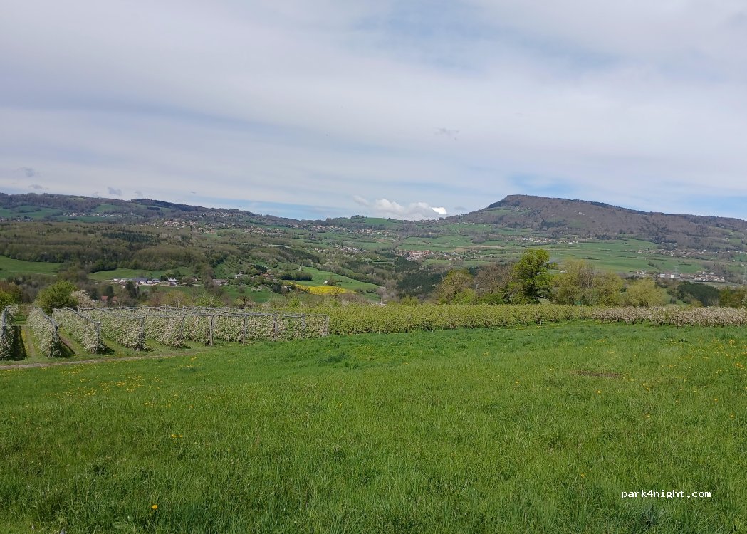 une superbe vue sur le tour des vergers avec une fontaine au niveau de l'aire de jeu emplacement limité à 1 ou 2 nuits maxi pour éviter ceux qui sortent les plantes vertes et le canari pour s'installer 1 mois ,merci de laisser l'endroit propre. Poubelle à disposition