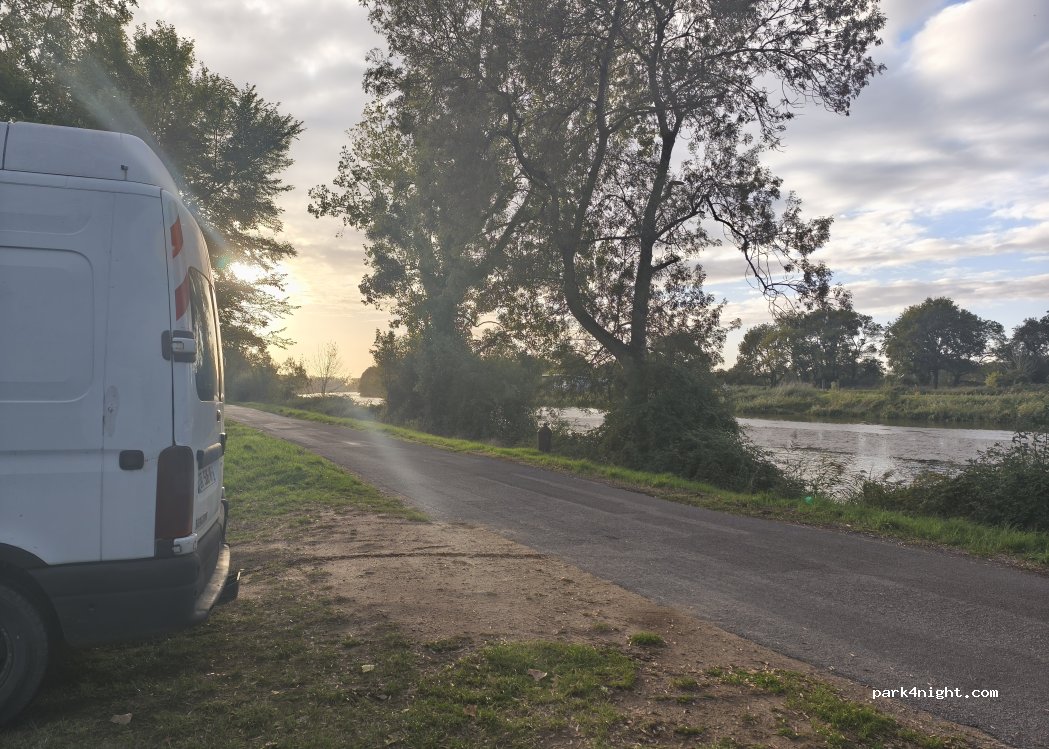 Un choix immense d’emplacement sur l’herbe au bord du canal. Très calme & bucolique, cette nuit fut très agréable, nous étions deux fourgons à s’y être arrêté, aucun regret. Toutefois attention aux insectes, surtout l’été ! Et savourez les sons des oiseaux et des animaux..