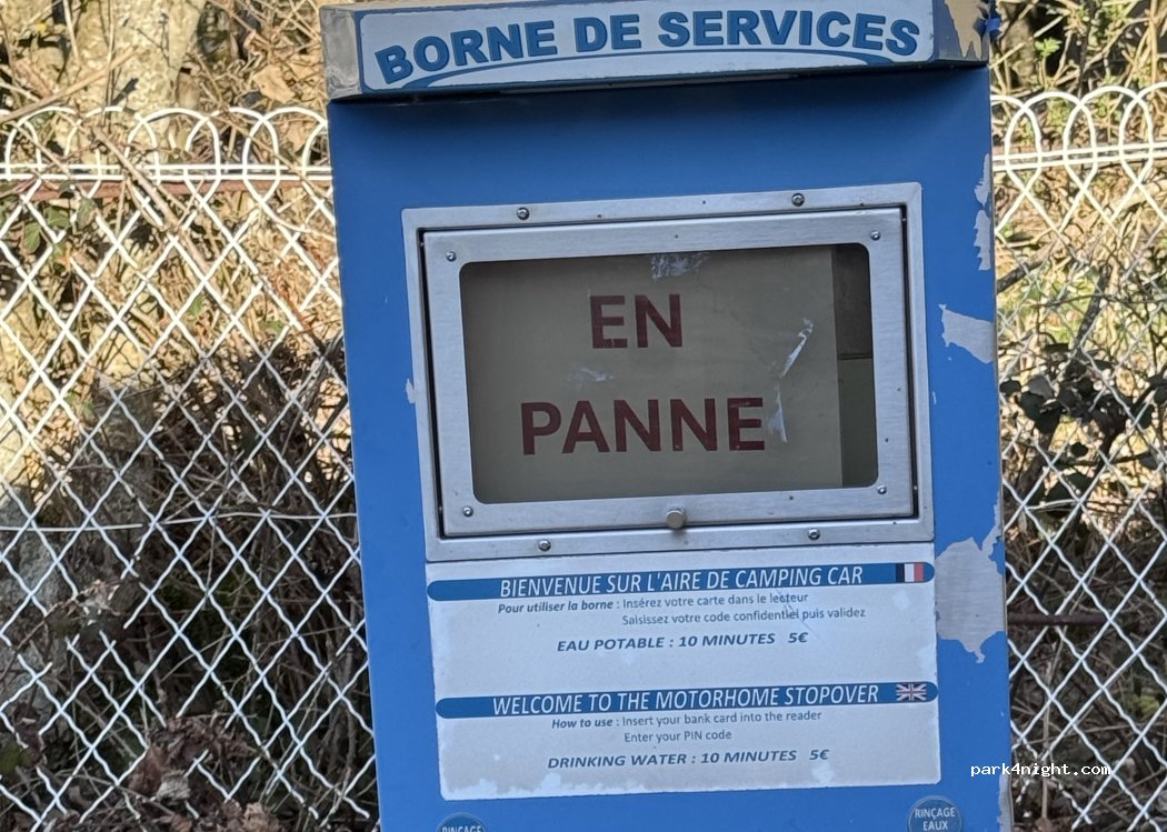 Borne toujours en panne ! merci la mairie ! zéro pointé ça fait 2 ans que l'on vient et c'est toujours pareil malgré le problème signalé ! je pense que les camping car ne sont pas les bienvenus ! tant pis on ira dépenser notre argent ailleurs !