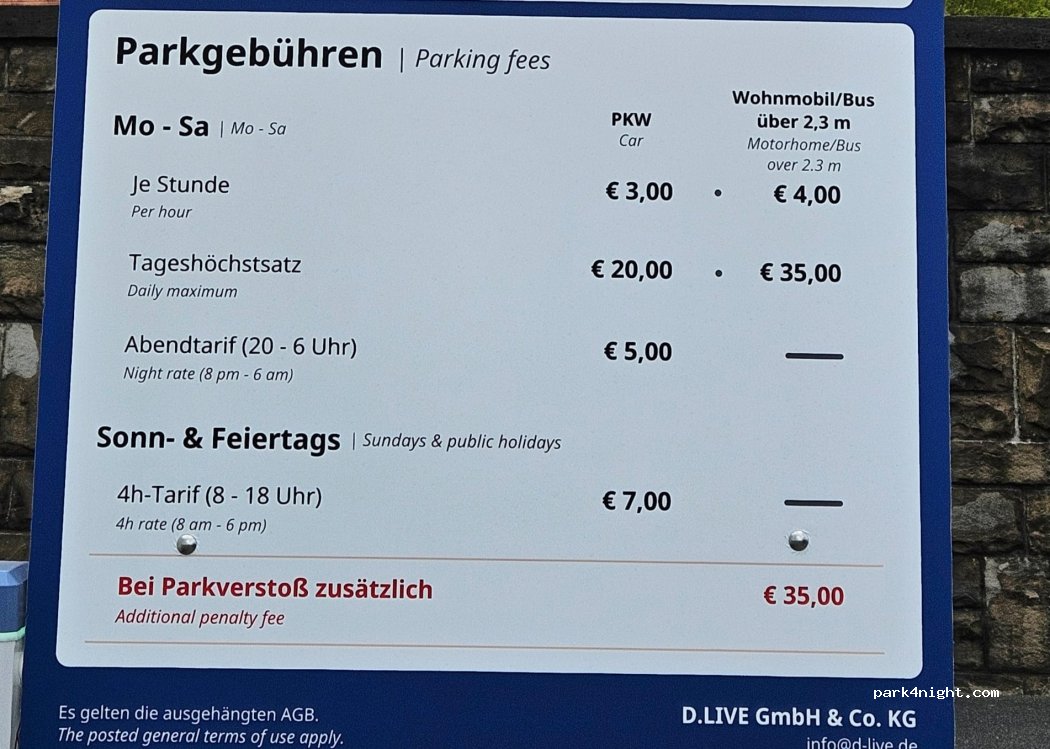 Aktuell wieder Preiserhöhung. Womo über 2.3m 35 EUR für 24 Stunden. Aber die Lage macht den Preis. Auch direkt an der Einfahrt sind grosse Parkplätze vorhanden die nicht nur für PKW zugelassen sind. Insgesamt deutlich mehr als die 20 in der Beschreibung.