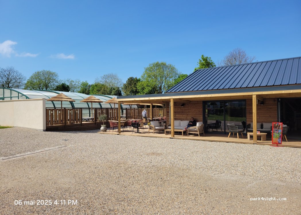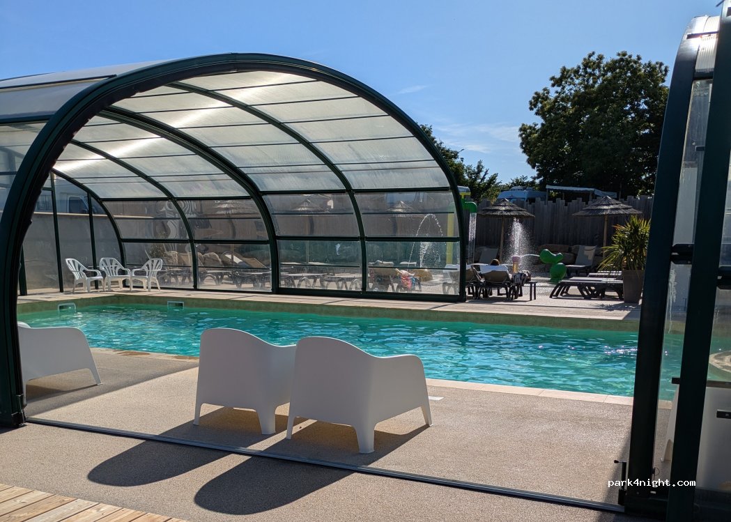camping 4 étoiles avec piscine couverte chauffée à 30°. personnels très accueillant. emplacements herbe avec haies bien délimitée. les sanitaires neuf et très propres . les 4 étoiles sont bien présentés. 27 euros l'emplacement camping car pour deux personnes la journée. (14h-12h le lendemain). on reviendra.