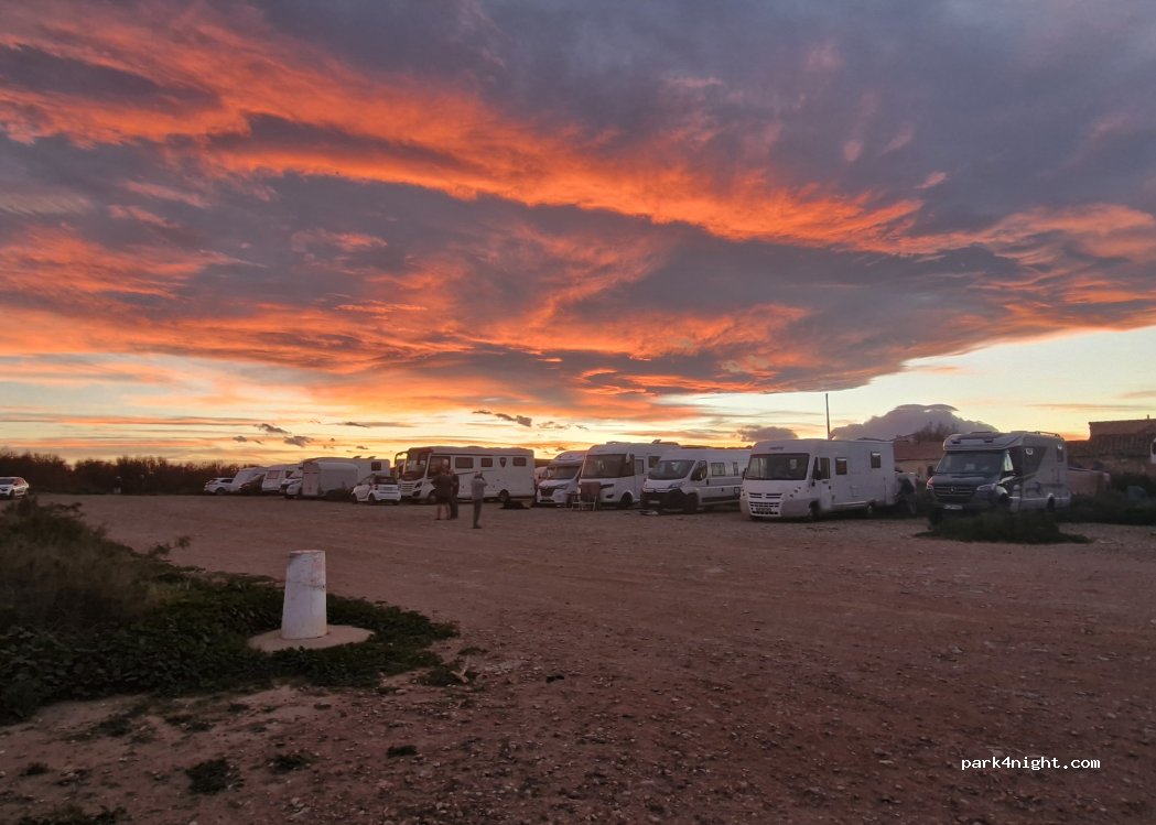 perfecto! mar por un lado y puesta de sol por las montañas. muchas autocaravanas y furgonetas, algunas con sillas y toldos, pero mucho espacio.