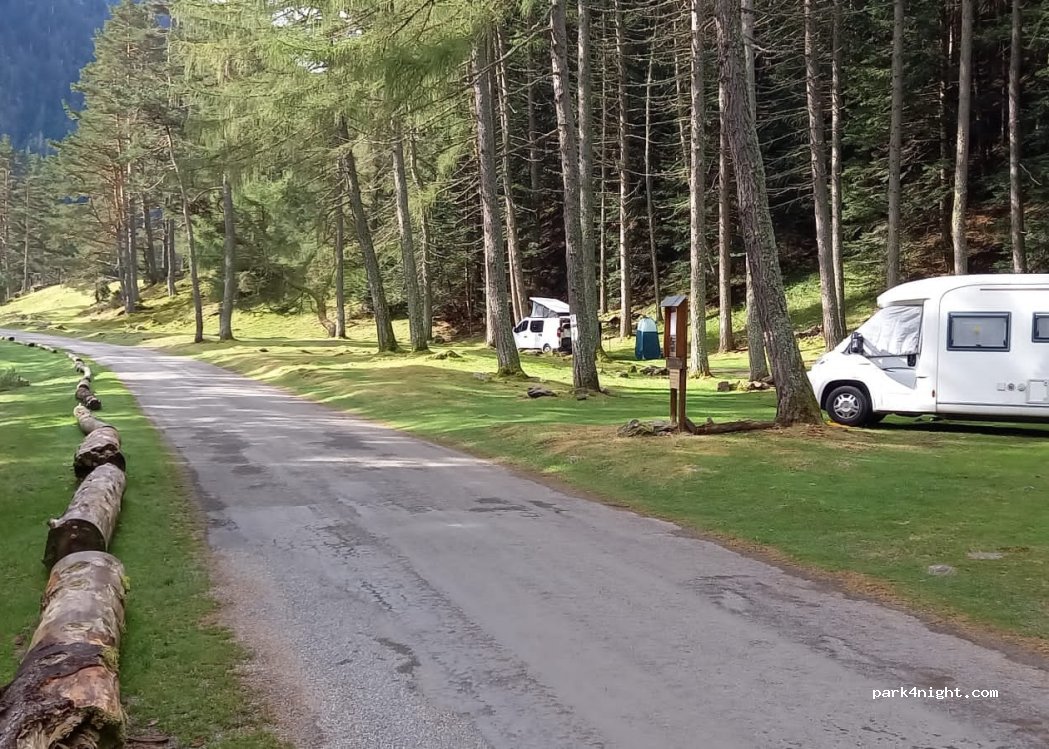 Parking jour et nuit gratuit. Pas de service sauf toilettes sèches. Près des départs pour les randos pédestres dans la vallée de Rioumajou ou la pêche, routes étroites par endroit, mais joli site.