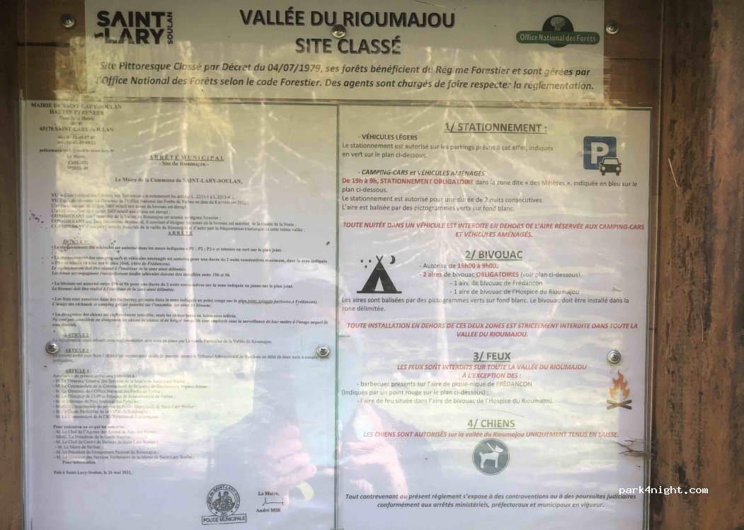 Parking day and night free. No service. Near the departures for hiking in the valley Rioumajou or fishing, narrow roads in places, but pretty site.