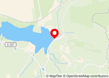 Étang avec emplacement parking 2 véhicules le long de la route et tables de picnic