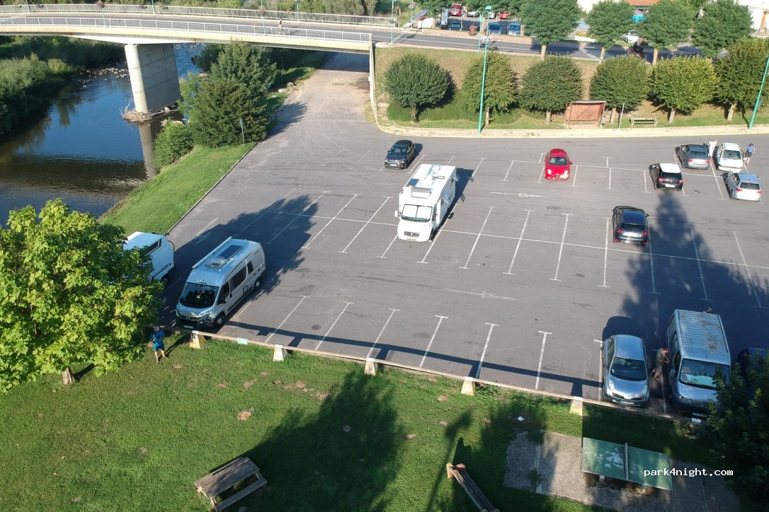 Had whole car park to ourselves. Very quiet during the night. Gets busier with cars from 9am onwards. Wi-fi bot working but hey not an issue! Breakfast right next to Dordogne with bread bought from Boulangerie 100m away. FYI Boulangerie only open till 1pm - closed in low season.