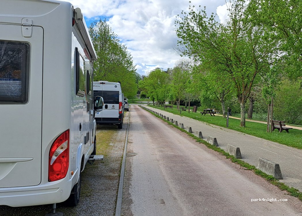 Ce n'est pas une aire de CC mais du stationnement sans délimitation. Accessible grand gabarit, je conseille quand même de vous mettre juste à l'entrée pour ne pas bloquer ou être bloquer plus loin ! Plat, et à l'ombre l'après midi ! Poubelles, tables de pique-nique, lac et loisirs. KarasGo - en bus de 12m