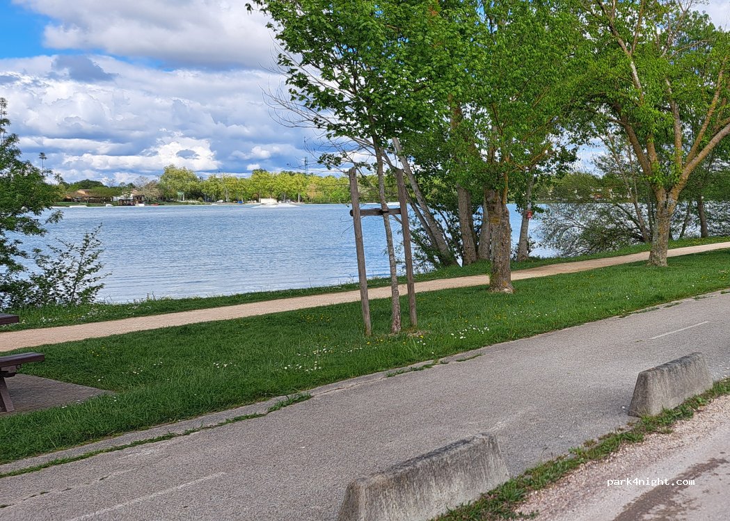 Parking gratuit tous véhicules tout en longueur entre la route très passante et le lac. Promenade sympathique autour du lac en cette journée hors saison malgré la météo maussade. Nombreuses tables de pique-nique. Proche du centre ville de l'Isle Jourdain dont l'église est à visiter. Certainement bruyant le soir et le matin.