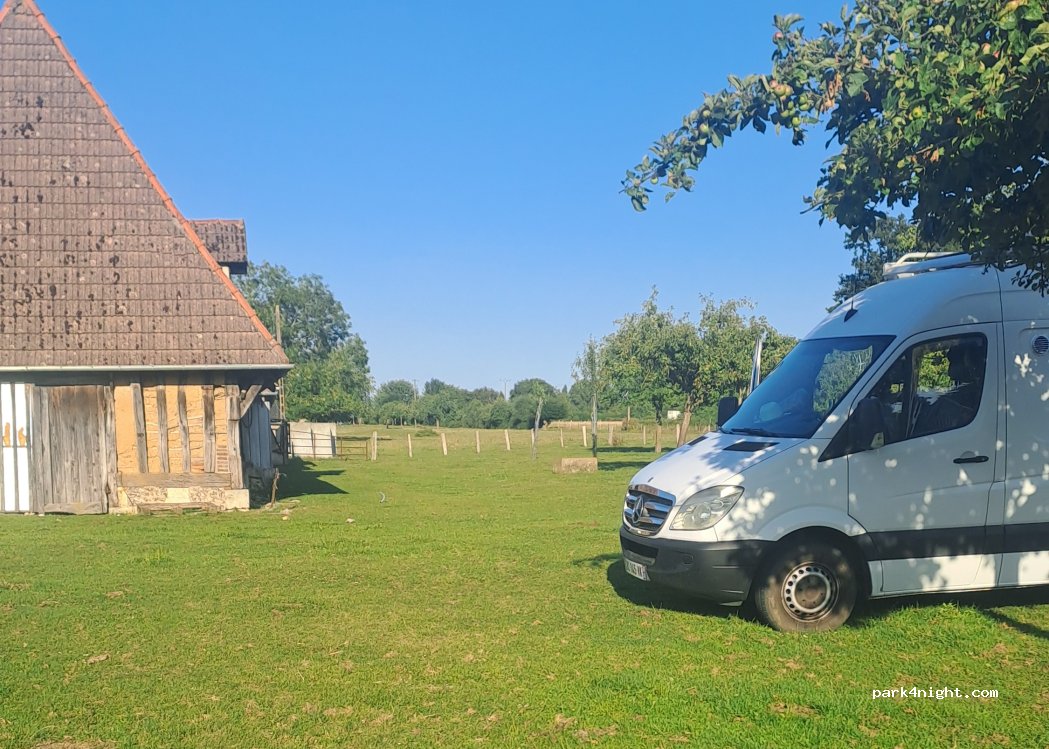 nous avons passer une agréable nuit au calme poser dans un verger après avoir visiter la ferme caresser les chèvres et participer à la traite, nous avons même pu goûter au lait encore chaud sortie du pie. propriétaire sympathique et accueillante qui nous a raconté l'histoire de sa ferme. et n'oubliez pas de passer à la boutique ses fromages sont très bon et le jus de pomme un délice.