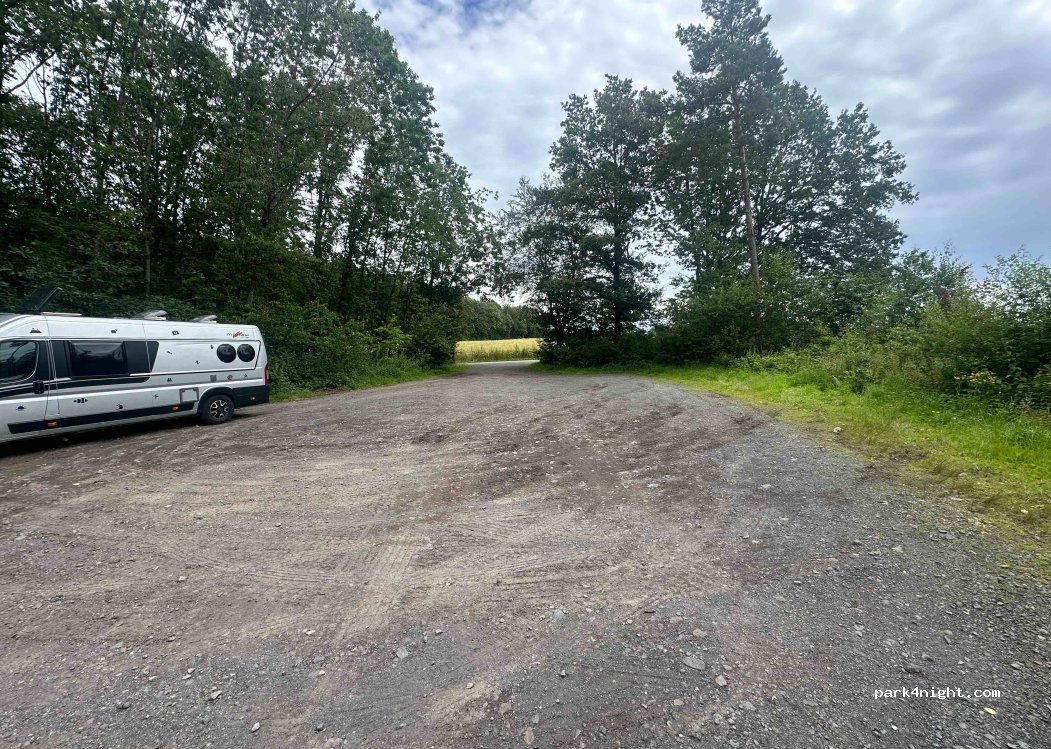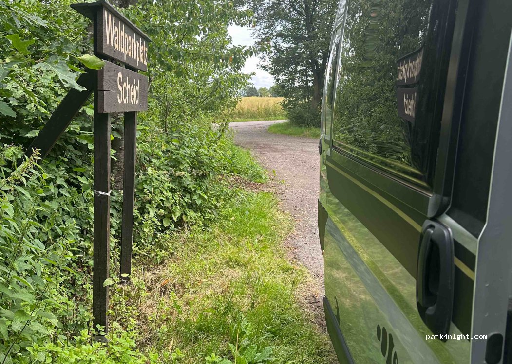 Wanderparkplatz an einer Straße. Tagsüber nicht unbedingt leise, aber für eine Nacht ok. Es gibt einen Mülleimer, Picknickbank und -Tisch. Direkt am Holzschild „Wanderparkplatz Scheid“ steht man sogar halbwegs gerade.