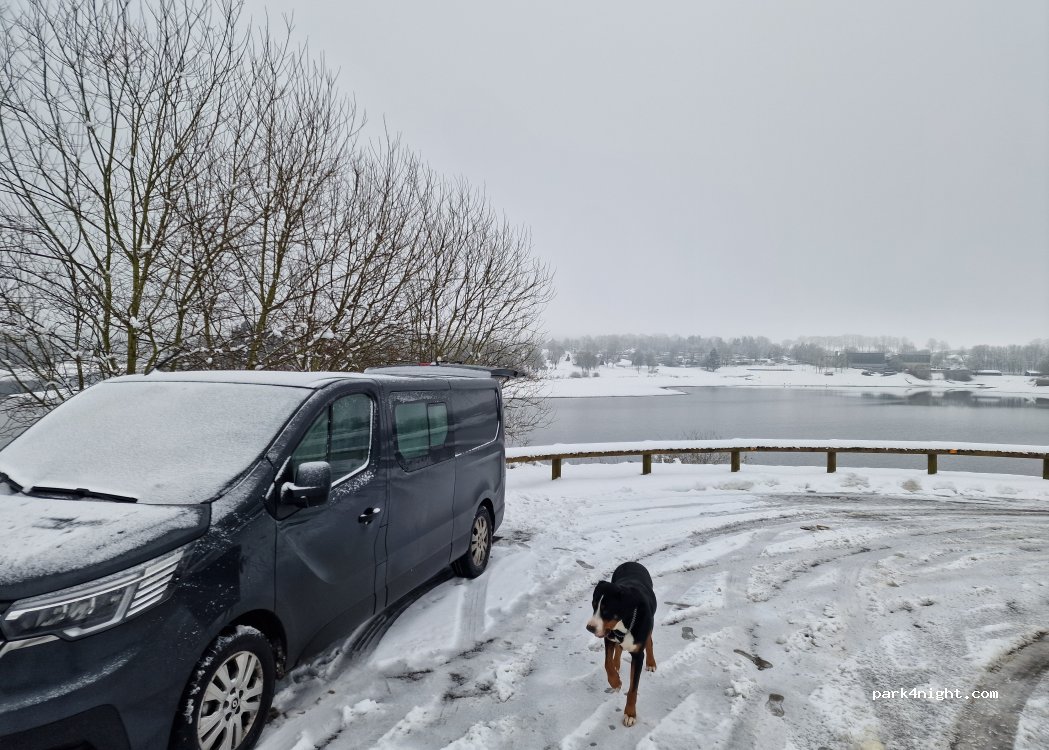 Goed gelegen parking zonder voorzieningen aan het meer. Rustig in de week, maar ik vermoed heel druk in het weekend ( bij mooi weer ). 5 euro overdag parkeren en 15 voor een dag en een nacht. De vriendelijke eigenaar komt zelf rond om het geld (cash) op te halen. Mooie wandeling rond het meer. Ideaal voor honden die graag zwemmen.