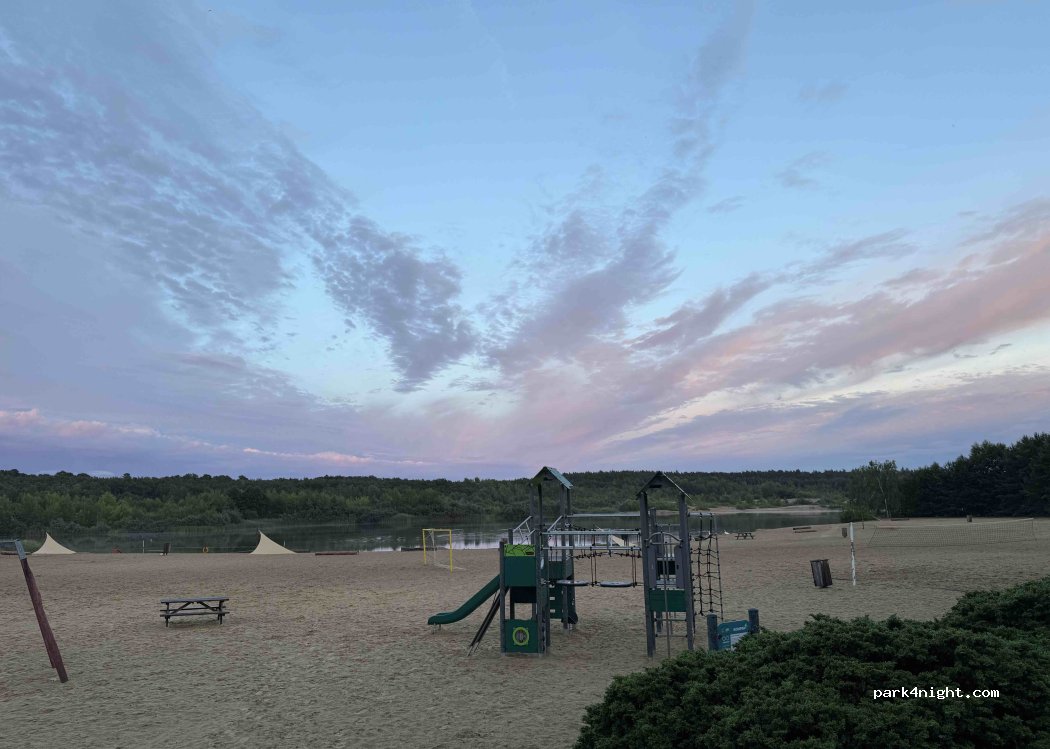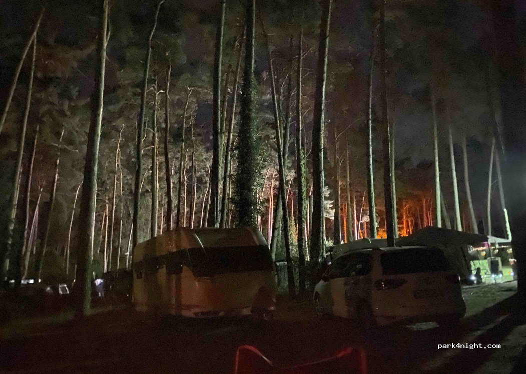 Campsite. Under pines. Nice at the lake. hardly suitable for larger mobiles. 10m length was the maximum and at 4m height it was really close to the trees ... swimming lake available. dog beach too.