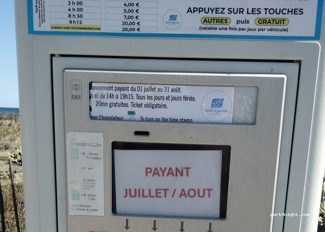 Parking très facile d'accès, plat, à 20m de la plage. Lieux calme et propre. Possibilité de dormir en hors saison de Octobre à Mai. À 10mn d'un supermarché à pied