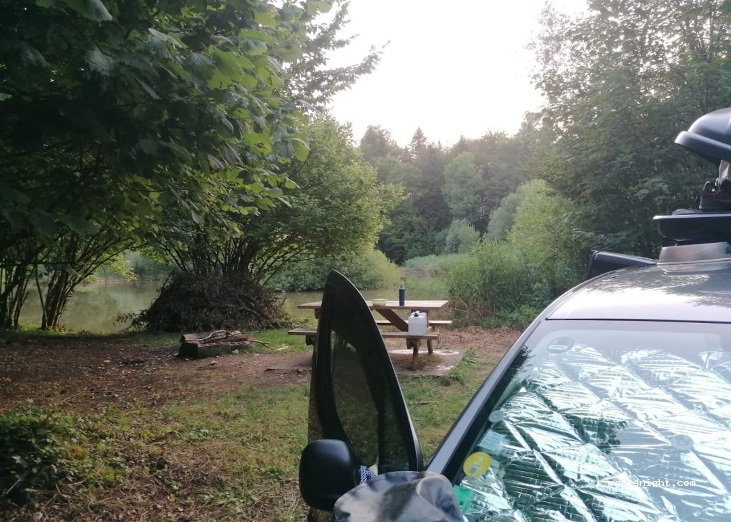 Spot très sympa, tranquillité absolue, le lieu de stationnement devant l’étang où se trouve la table était assez boueux nous nous sommes donc installés quelques mètres plus loin en bout de chemin en forêt.