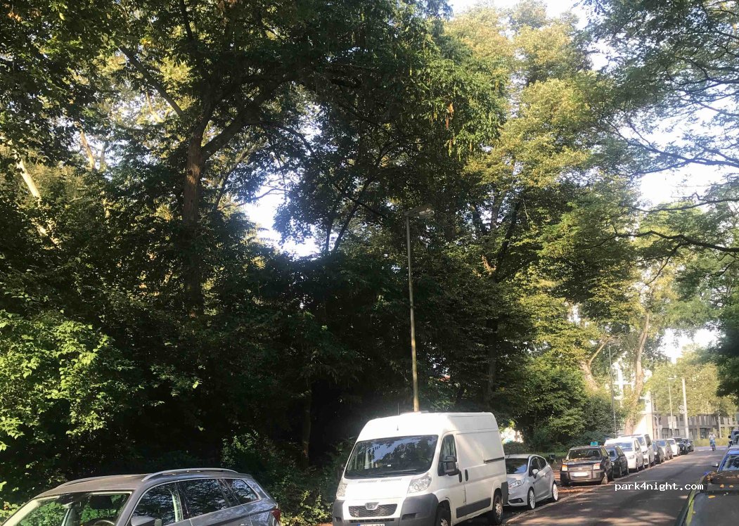 Dies ist ein öffentlicher Parkplatz an der Volksgartenstraße, direkt neben dem Volksgarten. Ideal für eine Übernachtung. Im Park etwa bis 22 Uhr gehen Passanten und Parkbesucher vorbei. Im Laufe des späteren Abends wird es ruhiger. Bei entsprechendem Wetter sind viele Menschen auf der Wiese im Park, ca. 200 m entfernt. das ist ein guter Platz, um sich hinzusetzen. Eine kleine öffentliche Trockentoilette ist ebenfalls zu Fuß erreichbar. Außerhalb der Corona-Zeiten gibt es im Park auch einige Restaurants. Ich habe hier mehrmals ungestört übernachtet. Die Übernachtung ist kostenlos (Parkticket werktags zwischen 7-23h erforderlich!). Und da der Parkplatz von vielen Pendlern genutzt wird, sind abends viele Plätze frei. Der Straßenverkehr stört kaum, da es nur wenige Autos gibt. Da der Park mit Auslauf gleich nebenan ist, freut sich der Hund.