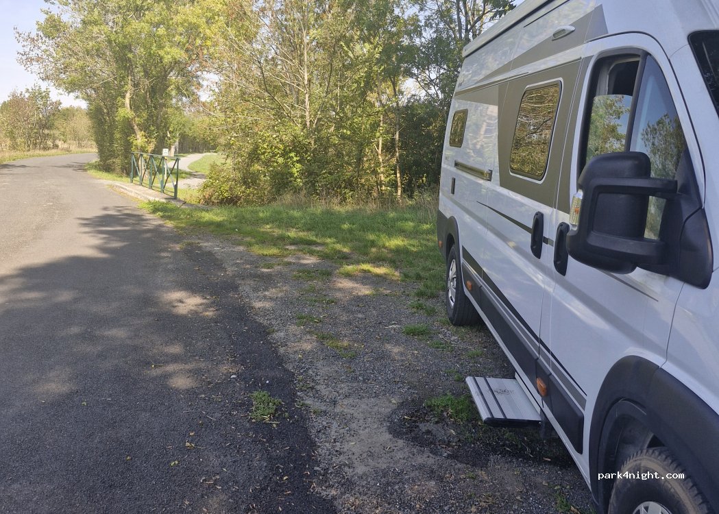 Nous y avons passé une nuit… embourbé sur la pelouse qui jouxte le petit chemin. Et au matin, une visite municipale: interdit d’y dormir. Les camping caristes doivent aller route des écluses à Saujon pour dormir!!