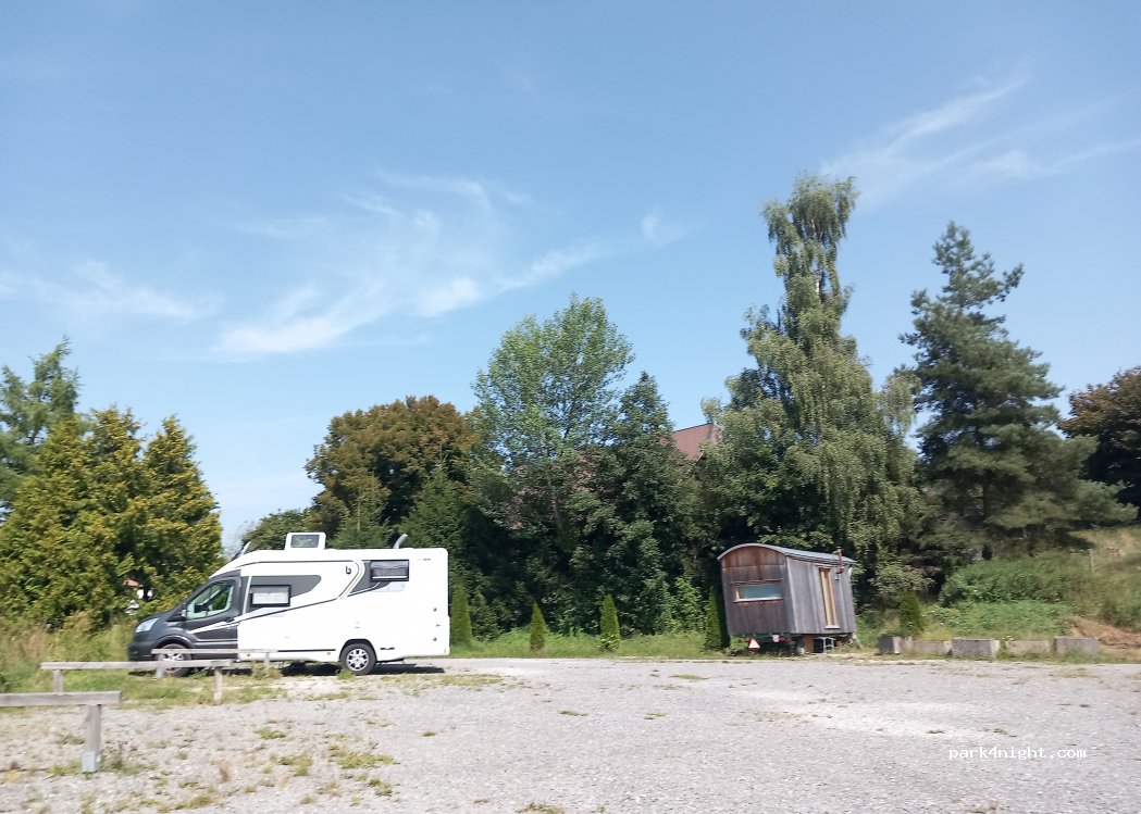 Cozy parking spaces near the biotope. Several barbecue areas. WC / showers. Water sewage. Great environment. Herd of bison. Herd of deer. Sunny. Great host in the log cabin. Food takeaway.