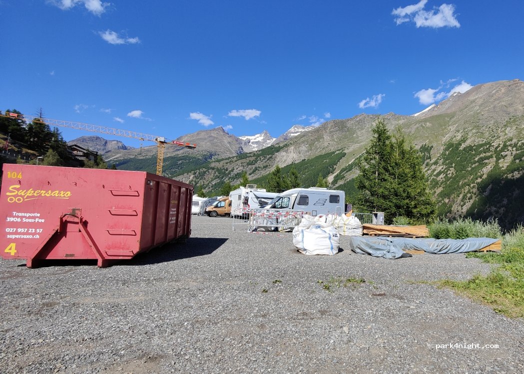 Area at the entrance to Saas Fee with possibility of water. If you pay for the visitor's card at the information kiosk at the entrance to the village, the price of parking is reduced. First you need to enter the area and collect the ticket, then you need to walk to the city and tourist information, the procedure for the visitor's card is carried out (take Idendity card and parking ticket with you), which is used to ride the cable cars for free (except Metro Alpin) and which is used in the parking lot cashier when paying before leaving the area. Electricity is included in the price (the key is fixed to the electricity box).