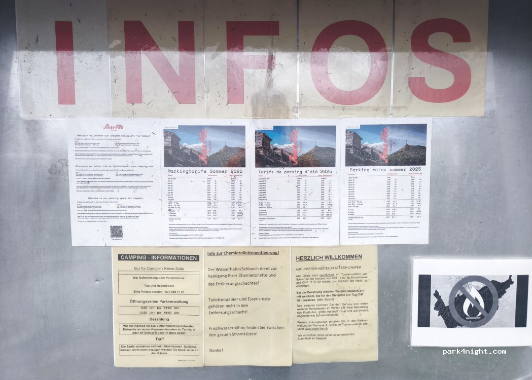 Zona all'ingresso di Saas Fee con possibilità di acqua. Se paghi la tessera visitatori al chiosco informazioni all'ingresso del villaggio, il prezzo del parcheggio è ridotto. Prima bisogna entrare in zona e ritirare il biglietto, poi bisogna andare a piedi in città e informazioni turistiche, si fa la procedura per la tessera del visitatore, che serve per salire gratuitamente sulle funivie e che si usa nelle cassiere del parcheggio al momento del pagamento prima di lasciare l'area. Per l'elettricità, è necessario richiedere la chiave all'ufficio del parcheggio (deposito).