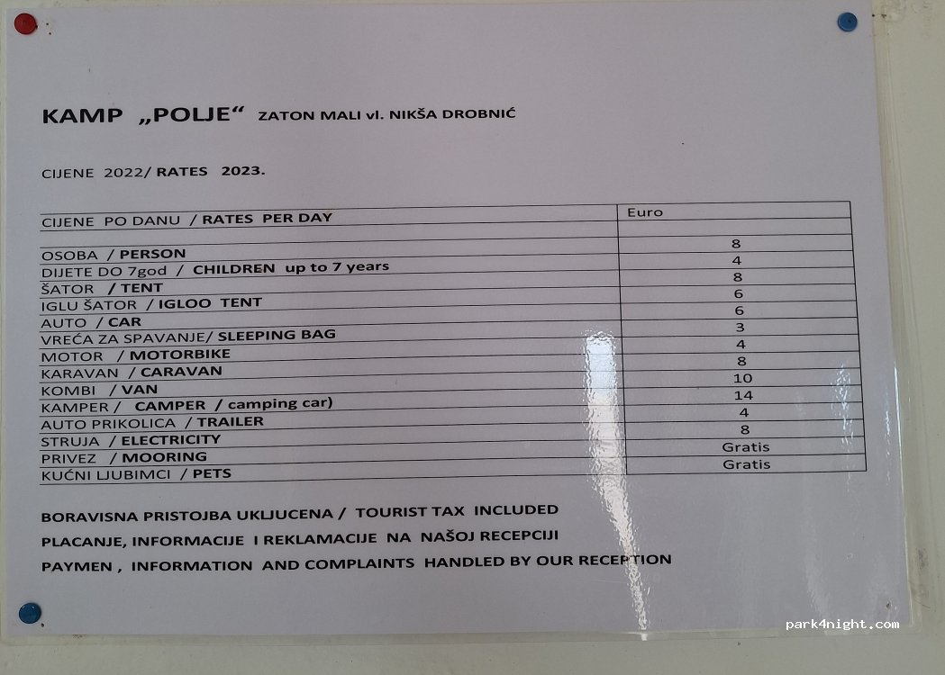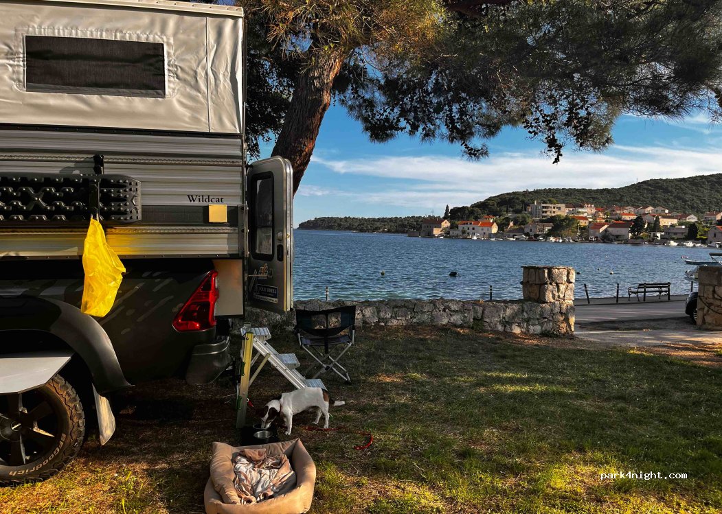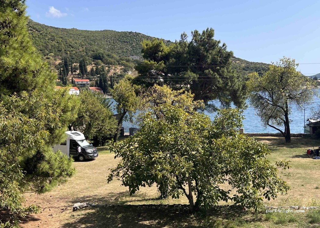 Niente smaltimento, niente elettricità, purtroppo la strada principale trafficata non è lontana. L'accesso non è facile per i camper di lunghezza superiore a 7 metri, soprattutto all'ingresso della strada principale. Ristoranti buoni ma costosi raggiungibili a piedi. 2P con camper 30€ senza scontrino.