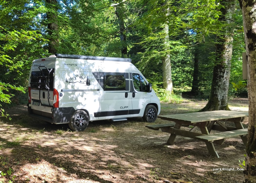 Petit parking en bord de route forestière, lieu agréable sous les arbres, pas de limite de hauteur, place pour un fourgon ou un camping-car. Une table de pique-nique. Départ de sentier de randonnée.