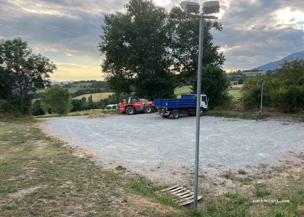 Grand parking gravillonné. Très calme, jolie vue sur la montagne. Poubelles ( en haut à droite) et WC (derrière le petit bâtiment en haut à gauche) propres avec eau chaude. Point négatif : aucune ombre sur le parking. Ombre sous les marronniers sur la pelouse en montant, très bien si l’on a une petite table. 4G Free OK.