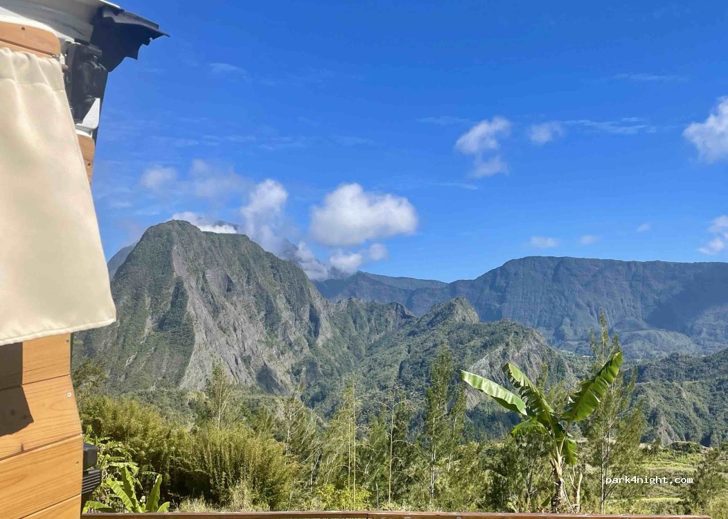Vue magnifique sur le cirque de Salazie. Table à pique nique Pas de point d'eau ni vidange A proximité de la route principale, ça peut être bruyant en journée.