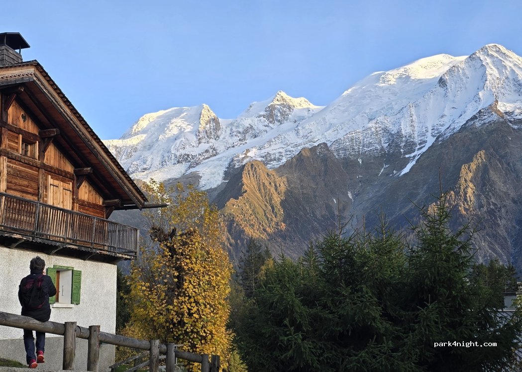 had the spot to ourselves, very quiet road, just a few houses at the end. sheltered by trees but with a great view of mont blanc - great spot!
