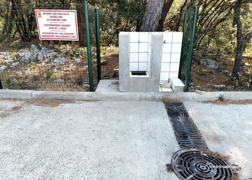 Belle aire toute neuve goudronnée et marquée avec ligne blanche , 8 branchements électriques type EU et eau bouton poussoir le tout hors service. Bien dommage surtout pour l eau qui est pourtant vital en cette canicule