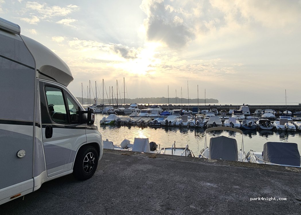 Jour et nuit OK Bar à proximité, pêcheurs, promeneurs. Facile d'accès. Nous avons laissé notre van (6m) pendant 3j pour rouler sur la Parenzana à vélo. Très safe et joli !