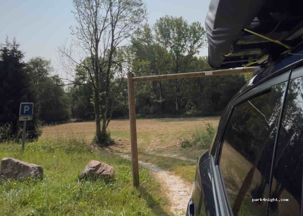 Barre à 2,10 m. Très grand parking en herbe avec des endroits ombragés en bord de rivière. Route un peu bruyante avec passage des voitures pour laisser les ordures aux bennes aussi. Dommage que certains manquent de respect : quelques detritus et PQ abandonnés sur place...