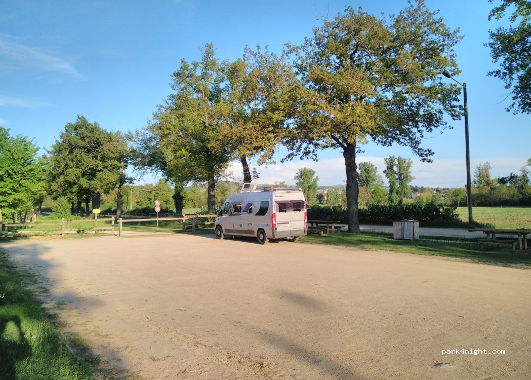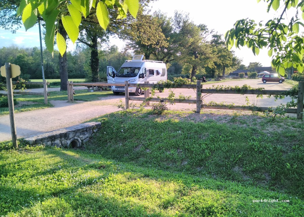 au bout de la route goudronnée prendre à droite direction la roseraie, tables, poubelles, un peu ombragé, le parc de la roseraie entrée gratuite, parc pour enfants. si au bout de la route goudronnée on continue 150 m tout droit, y a unautre petit parking, ( sans rien) en bord de rivière