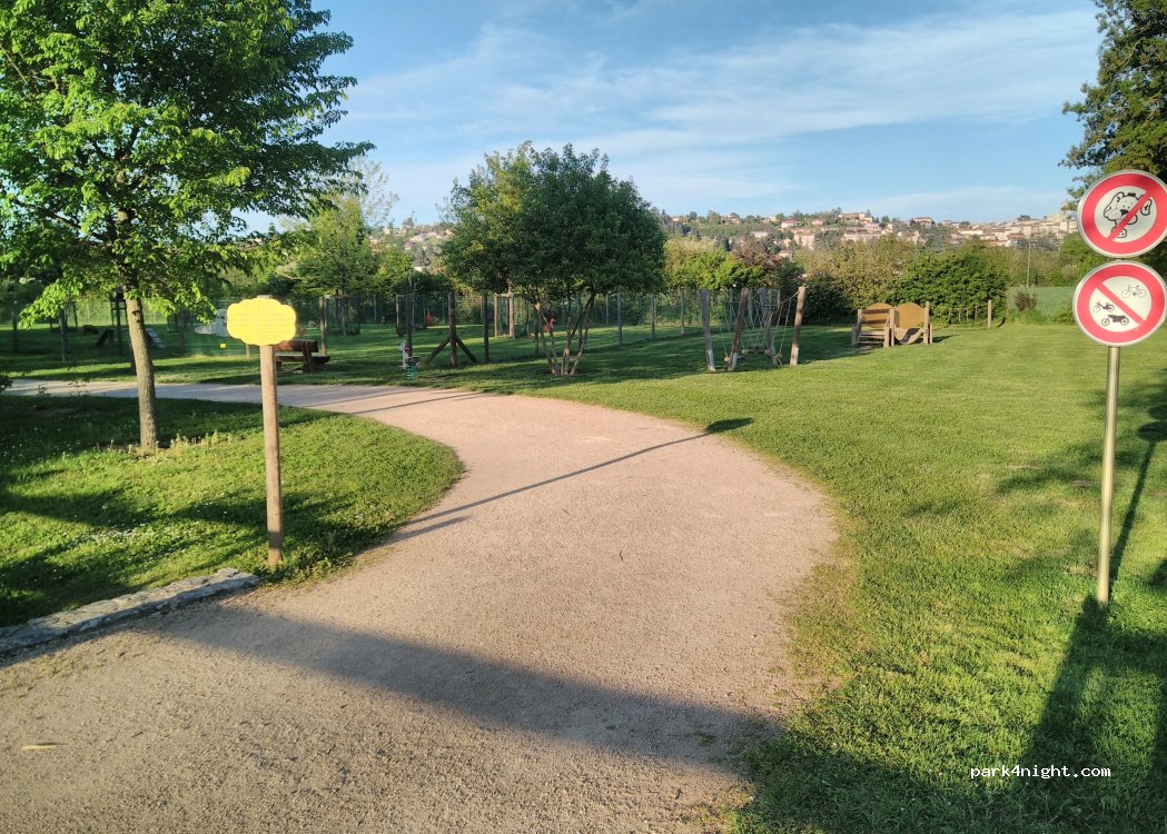 tables de pique nique, jeux pour enfants, poubelles, Roseraie en libre accès, mini ferme (chèvres, moutons, poules, coqs, paon) toilette publique entretenus derrière le bâtiment de la Roseraie, poney club juste à côté.