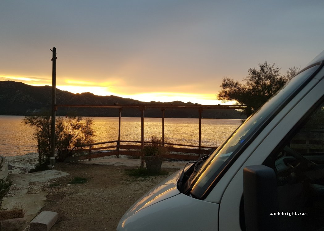 La vue est superbe. C’est une sorte de petit terre plain qui sert de resto de plage. Du coup hors saison ok. Une nuit tres calme. Descendre le plus bas possible apres le 1er parking. C’est raide mais sans pb en van .