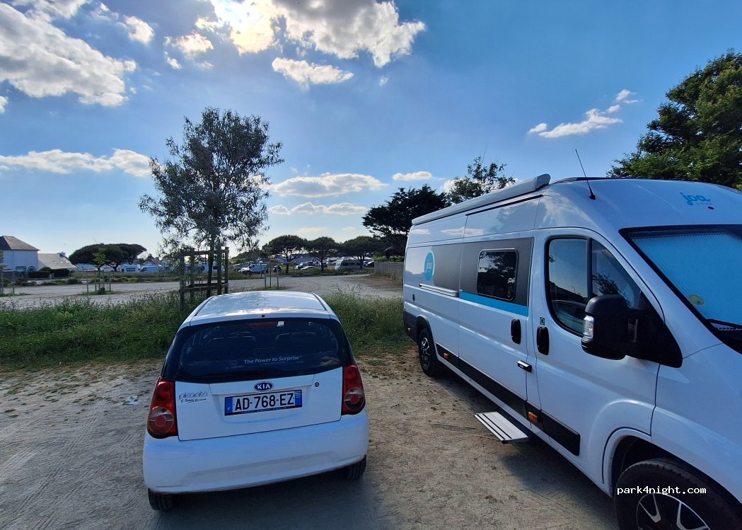 Nous voulions passer la nuit selon l'office du tourisme, si nous restions pour la nuit sur le parking d'en face nous étions verbalisables. On nous donne une aire près des tennis, 5.50 € la nuit un vulgaire parking sans aucun service. Nous sommes partis à Guidel, avons passé la nuit sur une aire gratuite face à la mer.