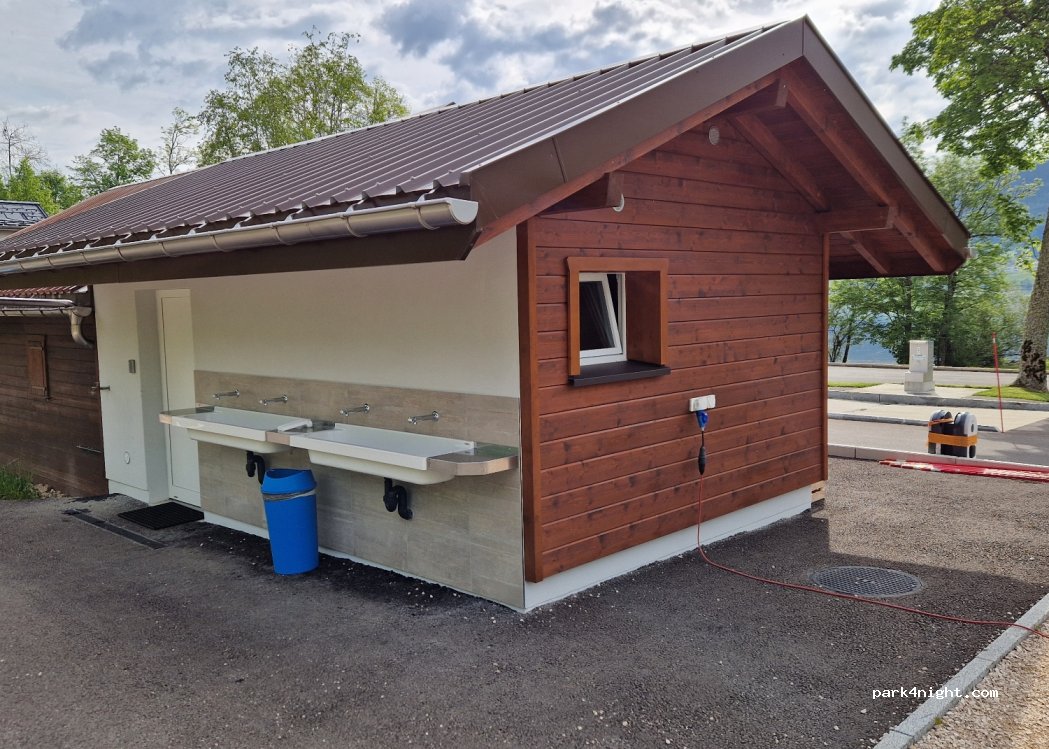 New service terminal installed by the communes of the Vallée de Joux. Free service, parking space approx. 40 CHF. Attached to campsite with sanitary facilities, newly furnished.