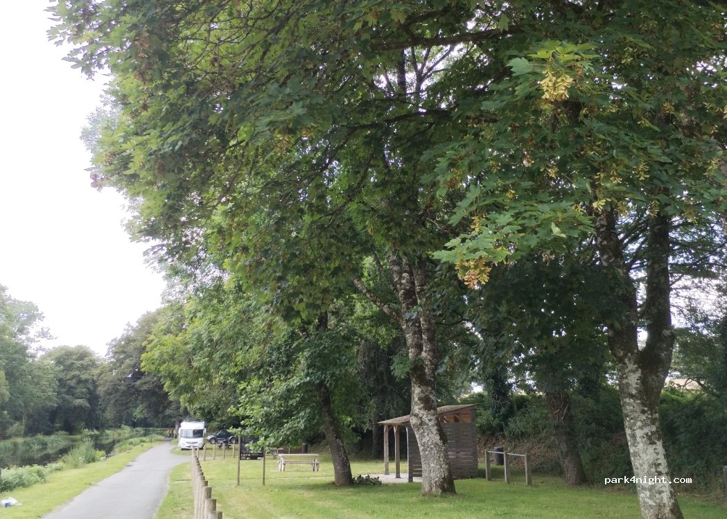 Car park, on the Nantes-Brest canal. Tolerated for parking (about 4 places for motorhomes on the roadside) and for 1 night, possible at the bottom after the camping tables (1 place so as not to disturb anyone!). be careful, the 1st photo with the motorhomes under the trees is no longer relevant! very pleasant spot, we slept well....