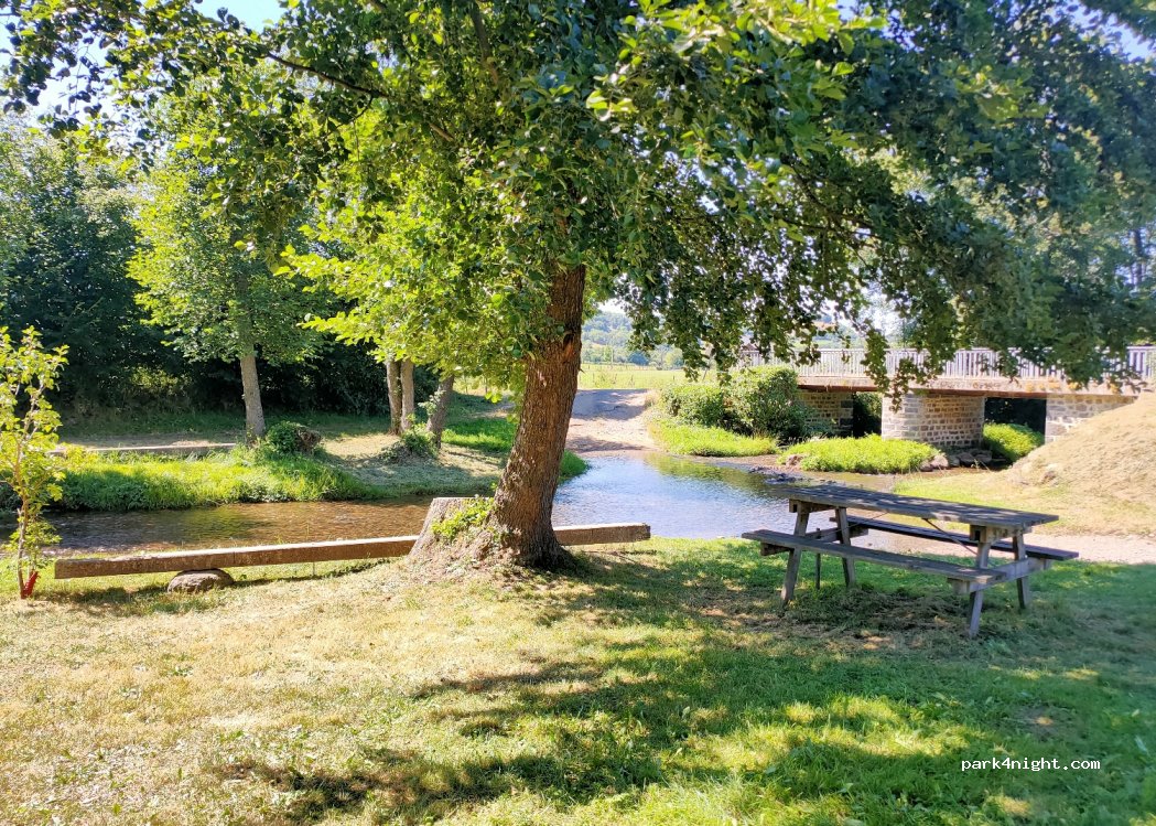 Super spot au bord de la rivière dans une belle prairie à plat avec les vaches comme voisines, dans le pré d'à côté; d'où la présence de mouches . Très fréquenté jusqu'à la nuit. Les gens du coin viennent se baigner et pique-niquer. Nous étions seul pour la nuit.