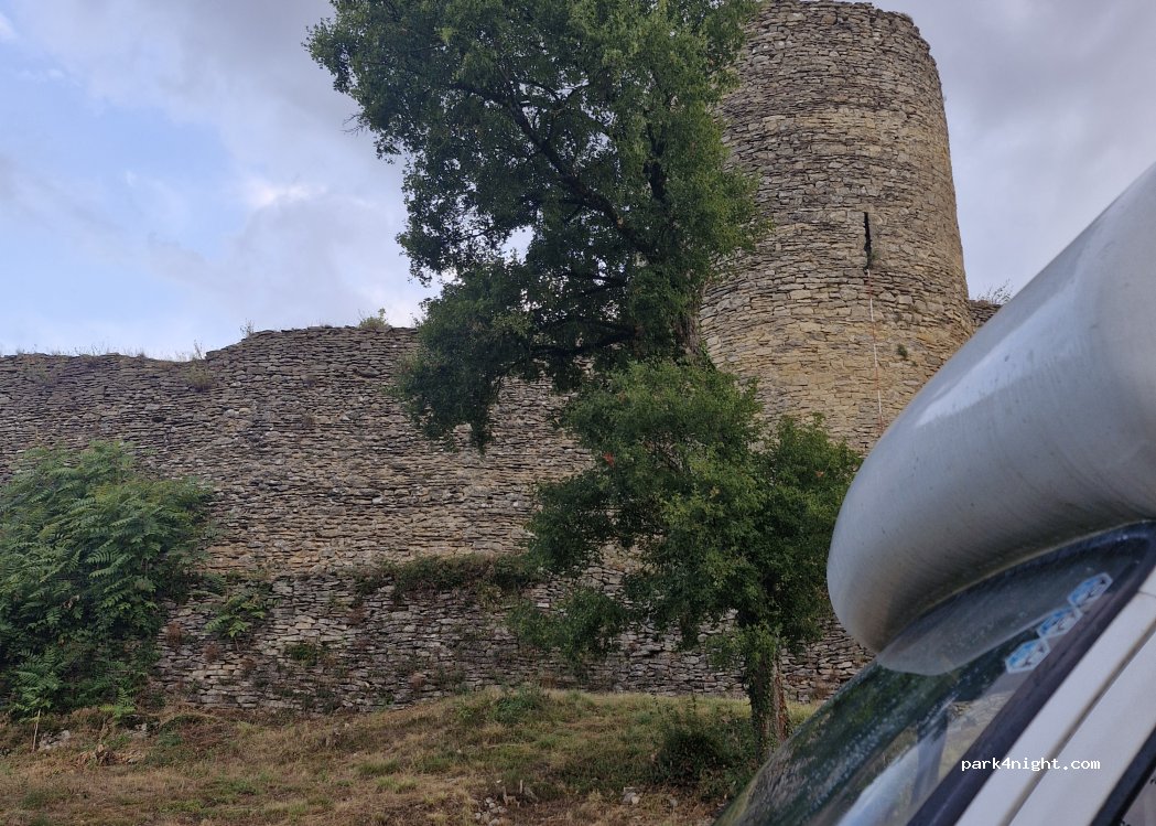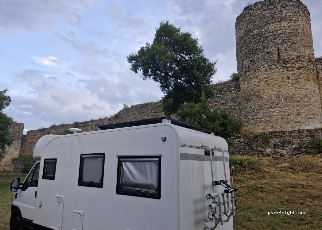Magnifique vue sur les remparts endroit apaisant et c’est un plaisir d’aller visiter les ruines présence d’une poubelle seul bémol quand une voiture de jeune est venu s’installer à côté la musique à fond au alentour de 21h sans aucun respect du coup nous avons fait pareil ouverture du van musique des années 90 a fond et au bout de 20 min ils sont partis nous avons pu profiter enfin de la nuit