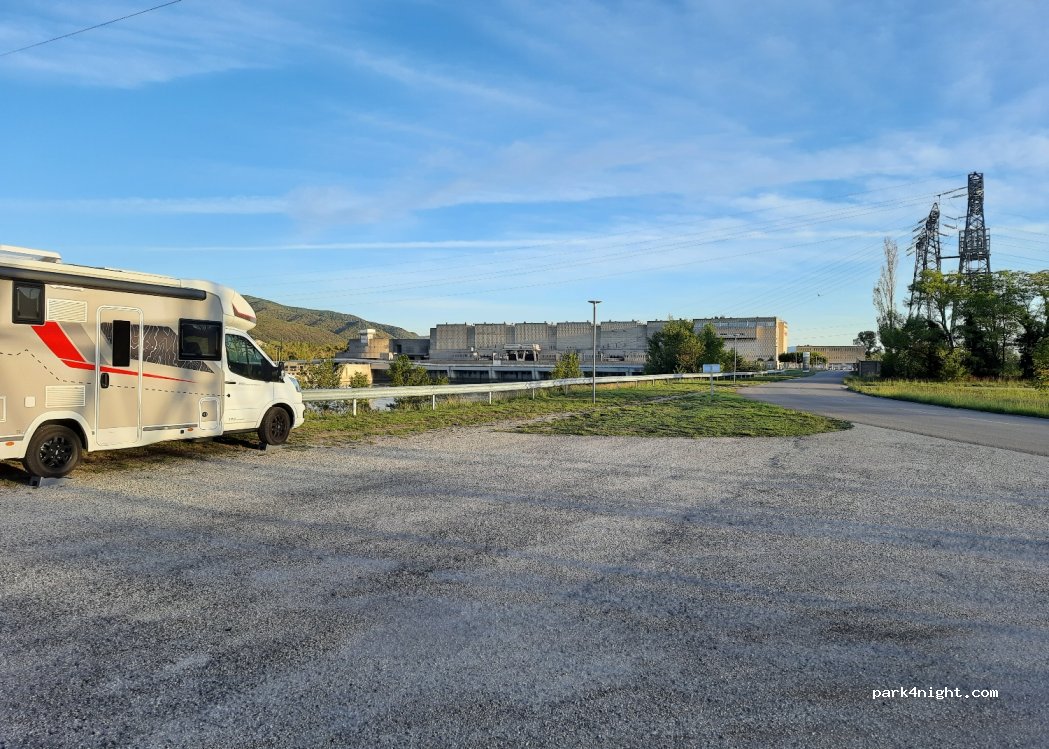 we stonden hier van zaterdag op zondag en dat was heel rustig. aan 1 zijde kijk je op de waterkracht centrale, aan de andere kant zie je de bergen. Ons hondje konden we een stukje verder los laten lopen in een rustig gebied waar het rook naar thijm en andere kruiden. Schone en rustige plaats.