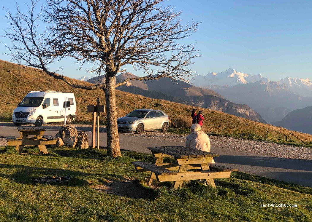 Point de vue incroyable ! Nuit très calme, nous n’avons pas entendu les vaches. Nous étions seulement 3 véhicules à passer la nuit ici :) Super repas sur les tables de pique-nique avec vu sur le Mont Blanc. Toilettes à dispo (état correcte)