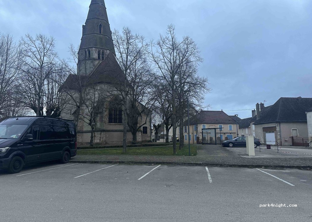 One of the church and town hall car parks, in the heart of a calm and reassuring village. We stayed here for one night without any worries.